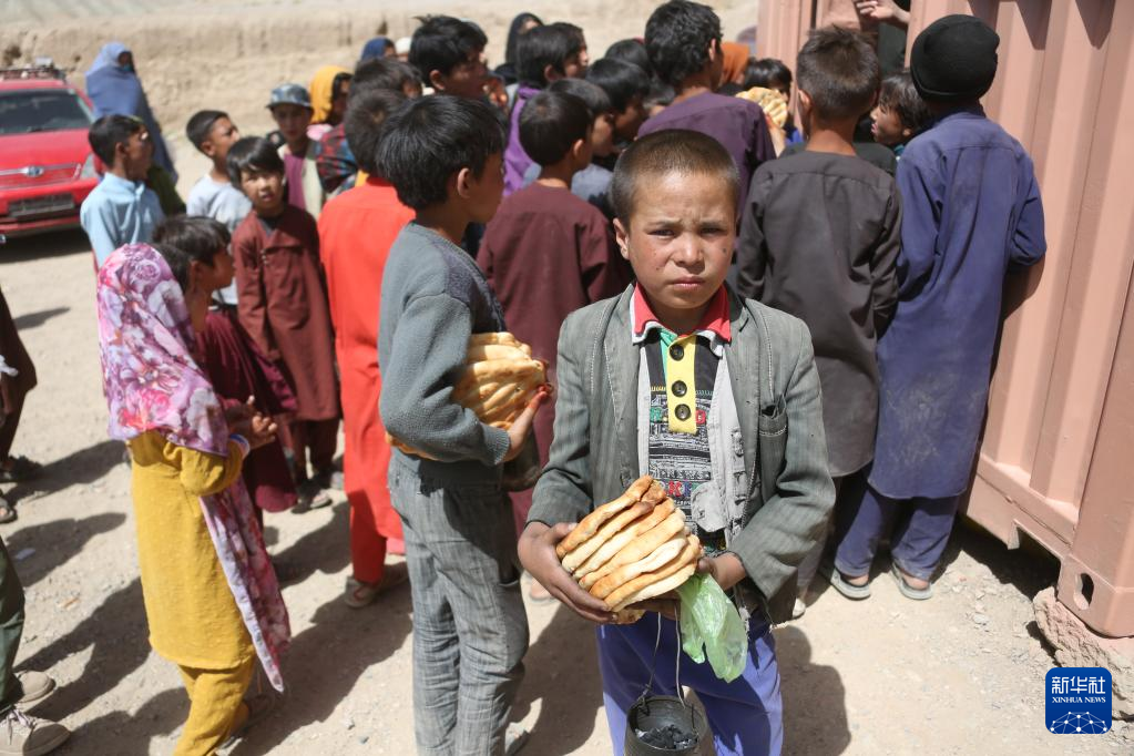 7月13日,阿富汗巴米扬儿童参加文物保护知识培训后领到食物。